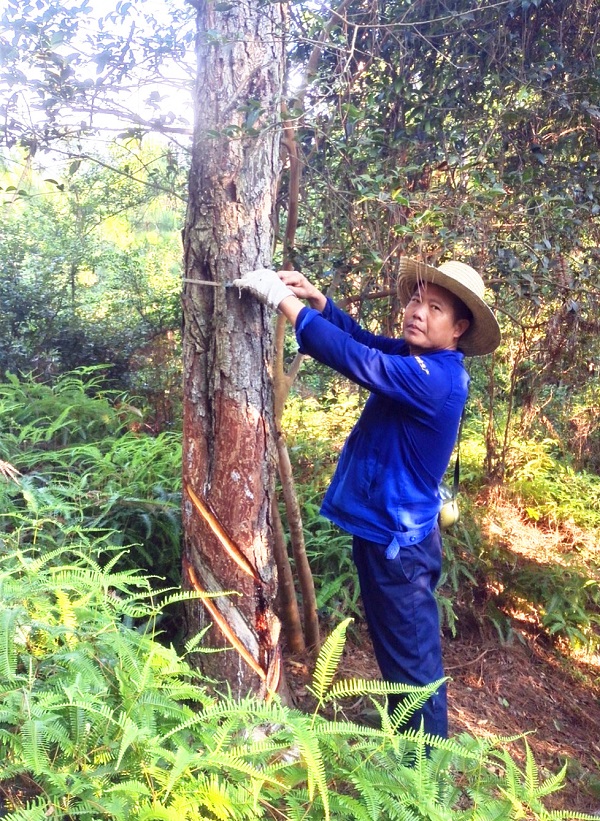 每年夏日是松树高产脂淡季,每年的采脂开刀从“立夏”起头,逾越全部夏日。每个采脂工人每年采割林木数目约6000株,每棵松树的采割刀数要到达35刀及以上。每个采脂工人天天采割林木数目约2000株,有人曾计较过,采脂工人天天在林地中步辇儿数目不少于40000步,也便是不少于20000米,这天天步辇儿20000多米啊,可不是在林荫大道落拓地漫步,不是在月下花前享用着浪漫,而是头顶骄阳,脚踏波折。